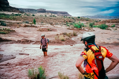 The night before our ride, there was an enormous thunderstorm with a torrential downpour and flash flooding in the desert. This necessitated a change in route. The original rout had us enter the Park in the north and bike to the Maze, spend a day in the Maze. The northern entrance was closed due to the deluge, so we entered from the south, biked two days to the Maze and then returned via the southern route. {more pictures}
