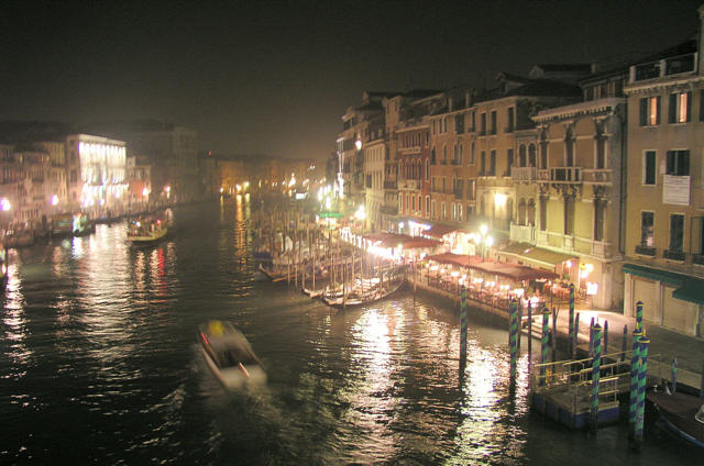The grand canal at night, from the Rialto bridge